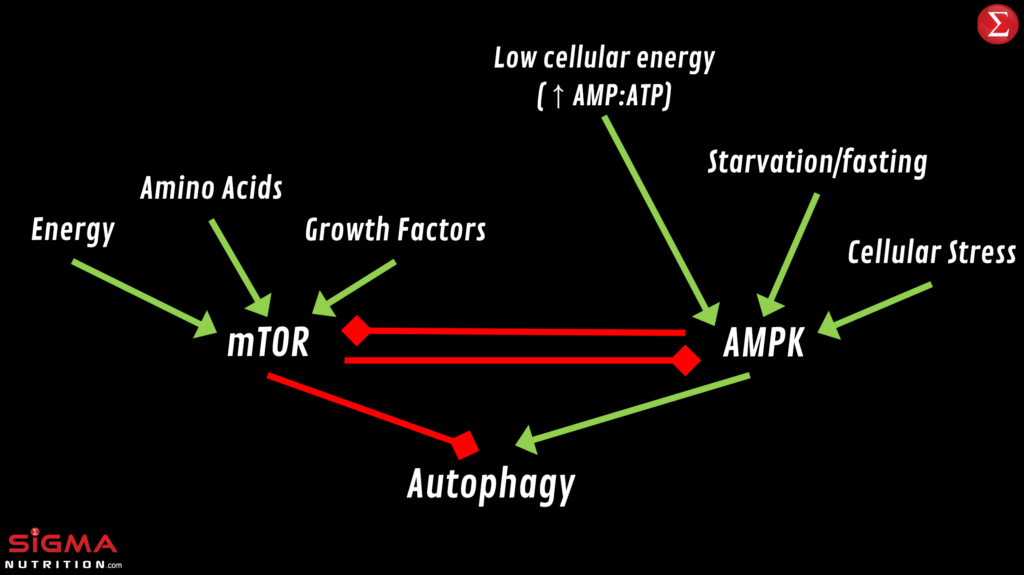 This thinking emerges from looking at the impact on certain nutrient sensing pathways in the body during fasting. So during a fast, with the lower levels of amino acids and glucose, there is a reduction in mTOR pathway activity, and an increase in AMPK activity. This can lead on to an upregulation of authophagy.