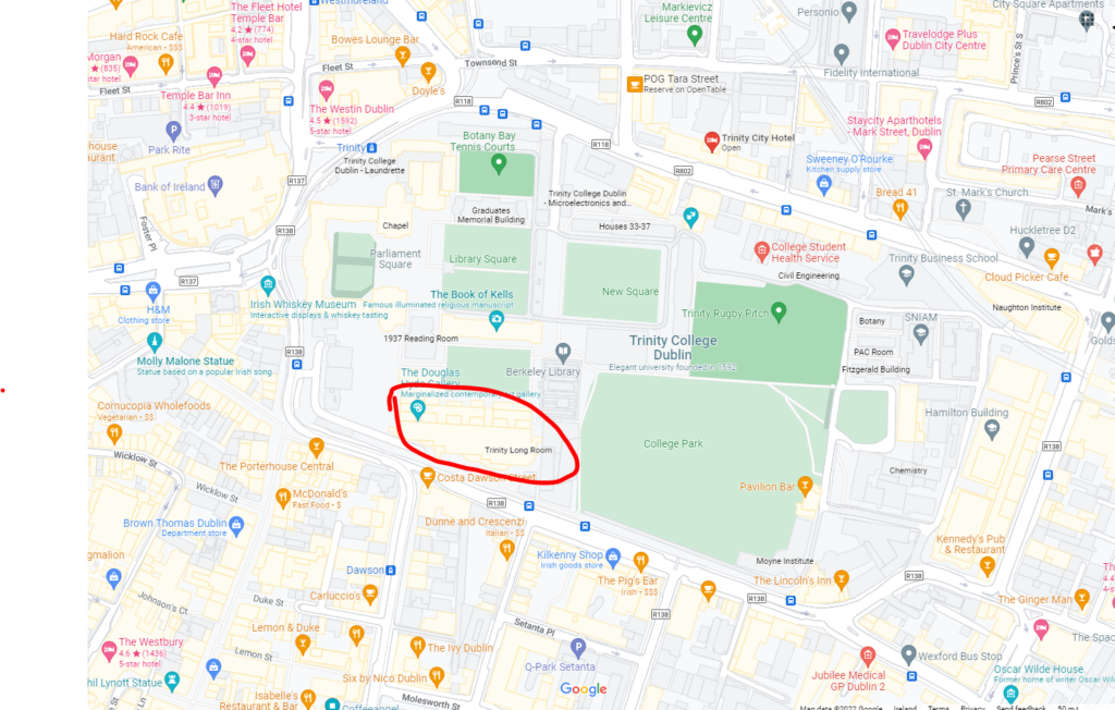 The Trinity Conference Centre is located at the Arts building, which is adjacent to Trinity’s iconic Library and Front Square. You can enter most conveniently via the Nassau Street entrance (at the bottom of Dawson St.), or easily through any other entrance to Trinity.