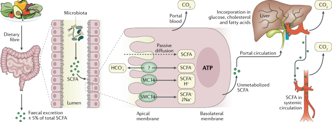 Enteroendocrine cells of the GI tract can produce and release specific molecules and hormones (such as the satiety peptide hormone, CCK) which transfer information to the brain. The fermentation of dietary fibres by bacteria in the colon produces metabolites called short-chain fatty acids (SCFAs). There are three main SCFAs produced in the colon: